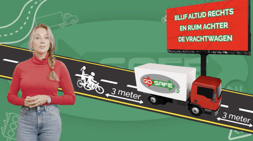 De leerlingen hebben vaak alleen als referentiekader hoe het in een personenauto is. Om duidelijk te maken hoe het zicht van de bestuurder van een vrachtwagen is laten we alle leerlingen virtueel plaatsnemen op de stoel van de chauffeur of chauffeuse. Als bestuurder maken zij een rit waarin diverse verkeersituaties aan bod komen. Daarna rijden de leerlingen als fietser en komen zij de vrachtwagen tegen in de situaties die ze daarvoor als bestuurder hebben meegemaakt. De leerlingen ervaren op deze manier hoe beperkt het zicht is van een bestuurder van grote voertuigen en hoe lastig dit in het verkeer is. Daarnaast geeft het deel als fietser heel goed aan waar je WEL kan staan buiten de dode hoeken van grote voertuigen.